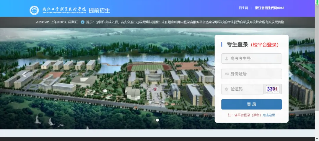 1.登录学校招生网(https://zs.zjipc.cn/),点击“飘窗-提前招生系统”。