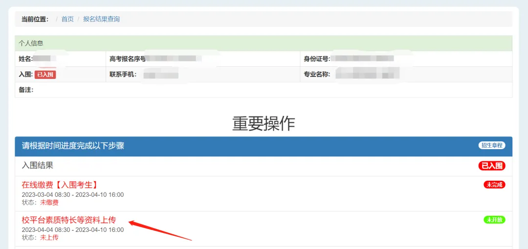 2.入围考生完成缴费后可点击素质特长资料上传完成素质特长项计分申请