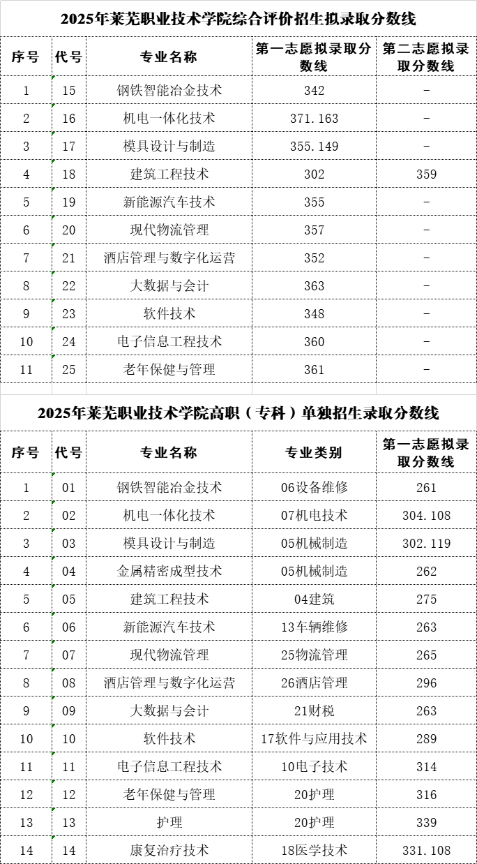 莱芜职业技术学院2025年单独招生、综合评价招生拟录取分数线