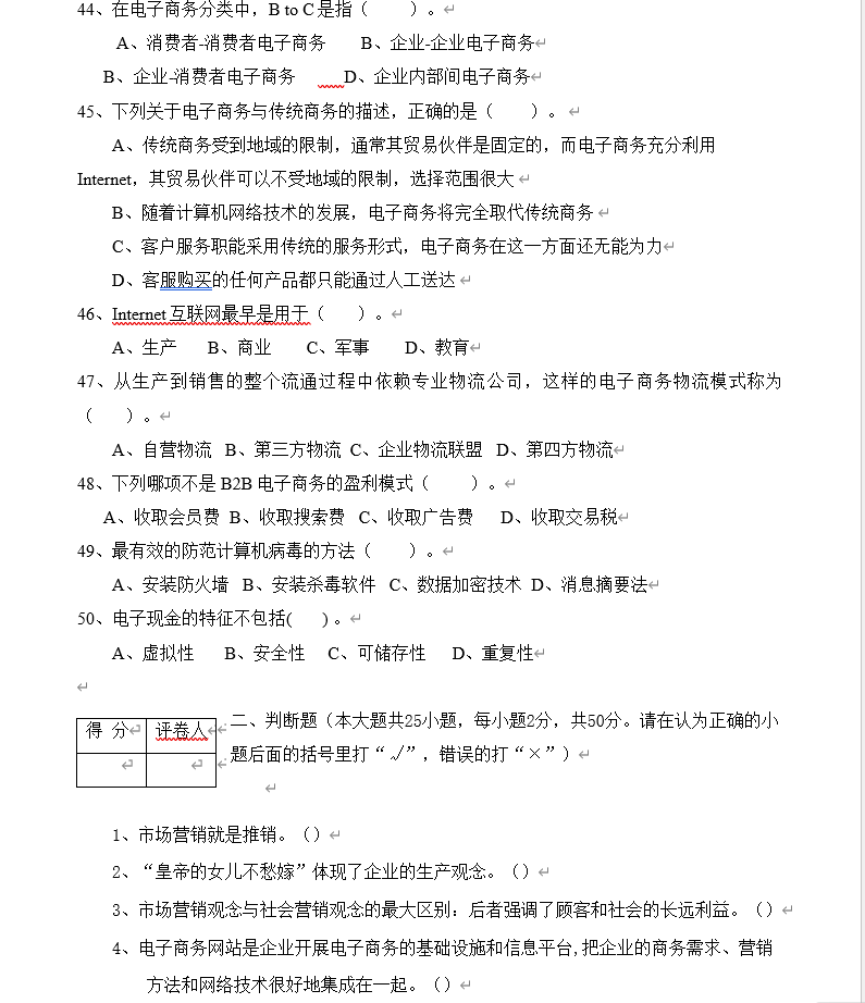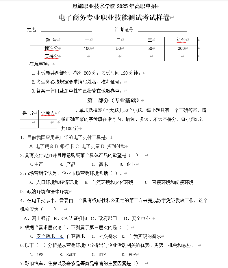 试卷结构:试卷由两部分构成,第一部分为专业基础,满分为150分。分为单选题和判断题,第一题为单项选择题,共50小题,每小题2分,共100分;第二题为判断题,共25个小题,每小题2分,共50分。主要内容包括电子商务、市场营销、网络营销、商务礼仪、推销技巧五部分。第二部分为技能操作,采用论述的形式进行,主要考察写作基础、知识运用、反应能力和职业取向等方面的内容,本部分一共5题,每题10分,共50分,根据考生的回答内容合理给分。