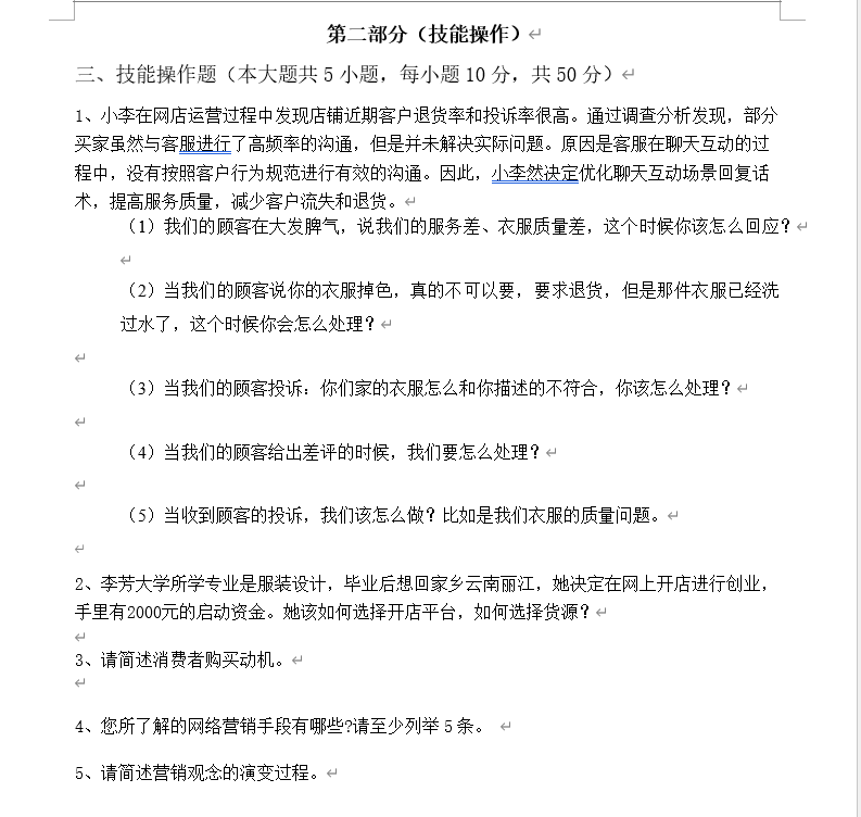 (3)技能操作题:一共5题,每题10分,共50分,根据考生的答题内容,依据参考