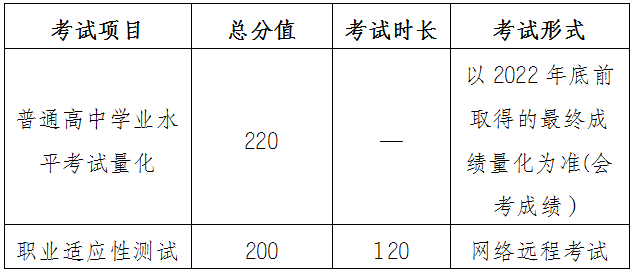 评价实行“普通高中学业水平考试量化成绩(会考成绩)+职业适应性测试”的方式。普通高中学业水平考试量化成绩满分220分;职业适应性测试考试内容为职业道德、信息技术、心理健康,成绩满分200分;总分420分。录取以两项成绩综合择优录取。