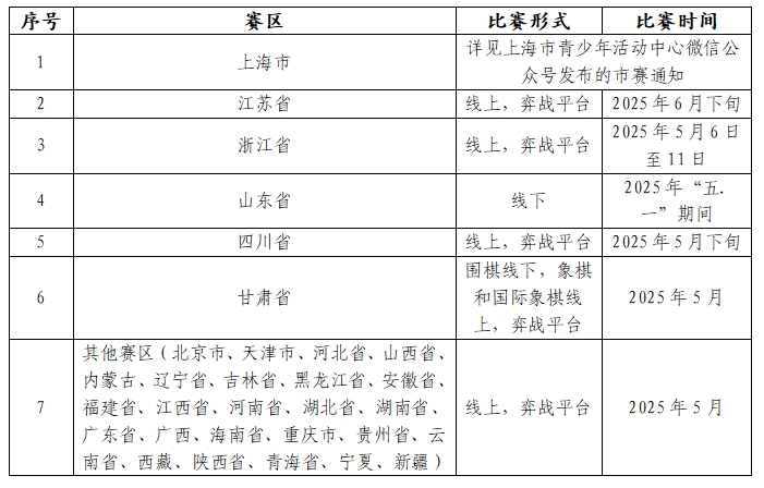 各省级赛区比赛形式将根据报名人数作调整,以省级赛通知为准另行发布;棋类项目线上参赛手册另行发布,详见“全国青少年传统体育项目比赛”微信公众号和赛事网站https://bm.qsng.cn/eduplatform/html/gxjs/#/head/index“赛事公告”栏目。