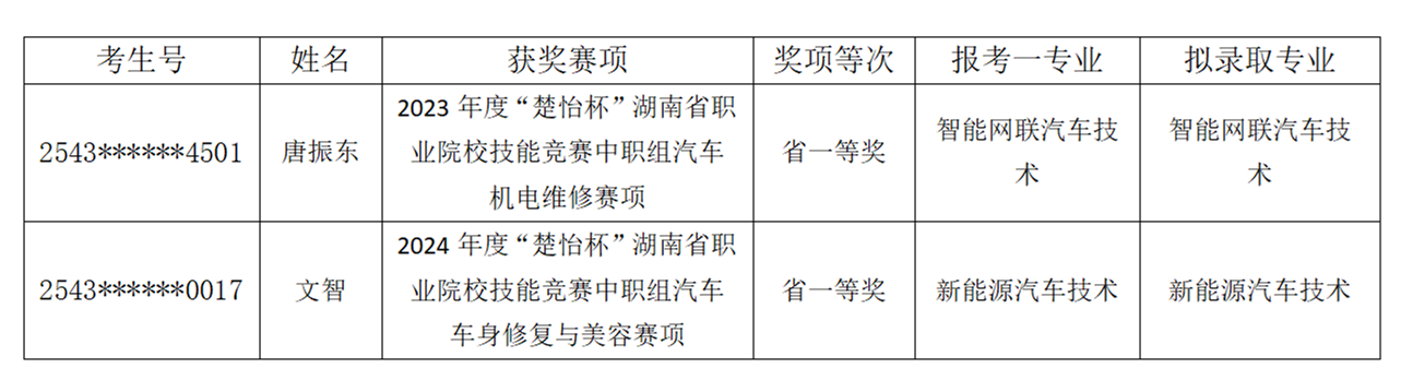 根据《关于做好2025年普通高校职业技能赛事获奖学生推荐免试工作的通知》(湘教考通[2025]2号)要求,按照我校2025年单独招生章程,学校组织对申请免试的考生进行了初步审核,共有2名考生符合我校免试拟录取条件,现将名单进行公示。公示期为2025年3月5日至3月7日。如对公示名单有异议,可在公示期内向学校招生就业处反映,逾期不再受理。联系方式:0731-84099000、0731-84099018。