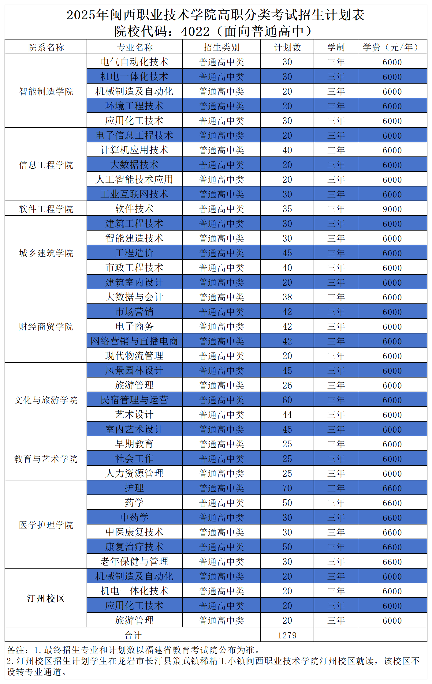 2025年闽西职业技术学院高职分类考试招生计划表
