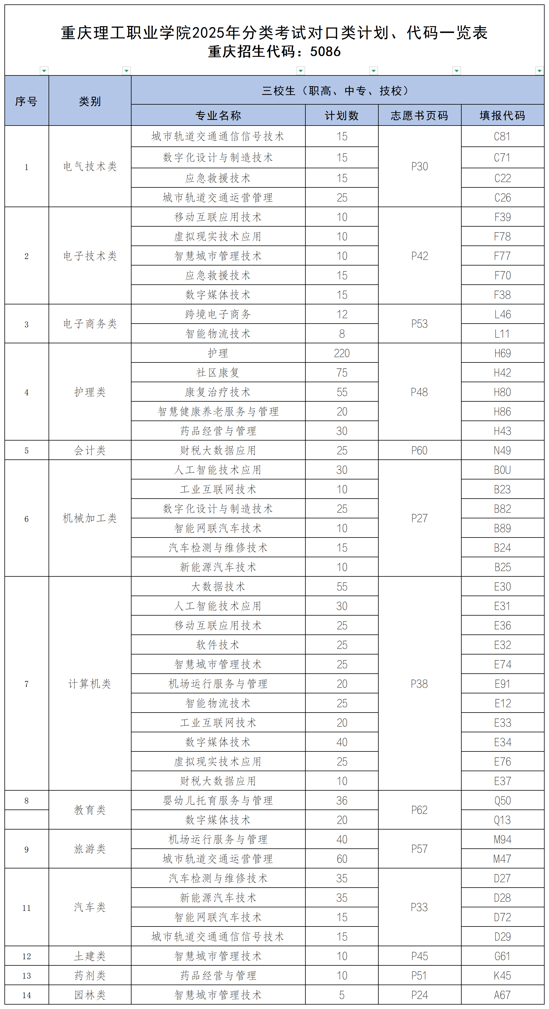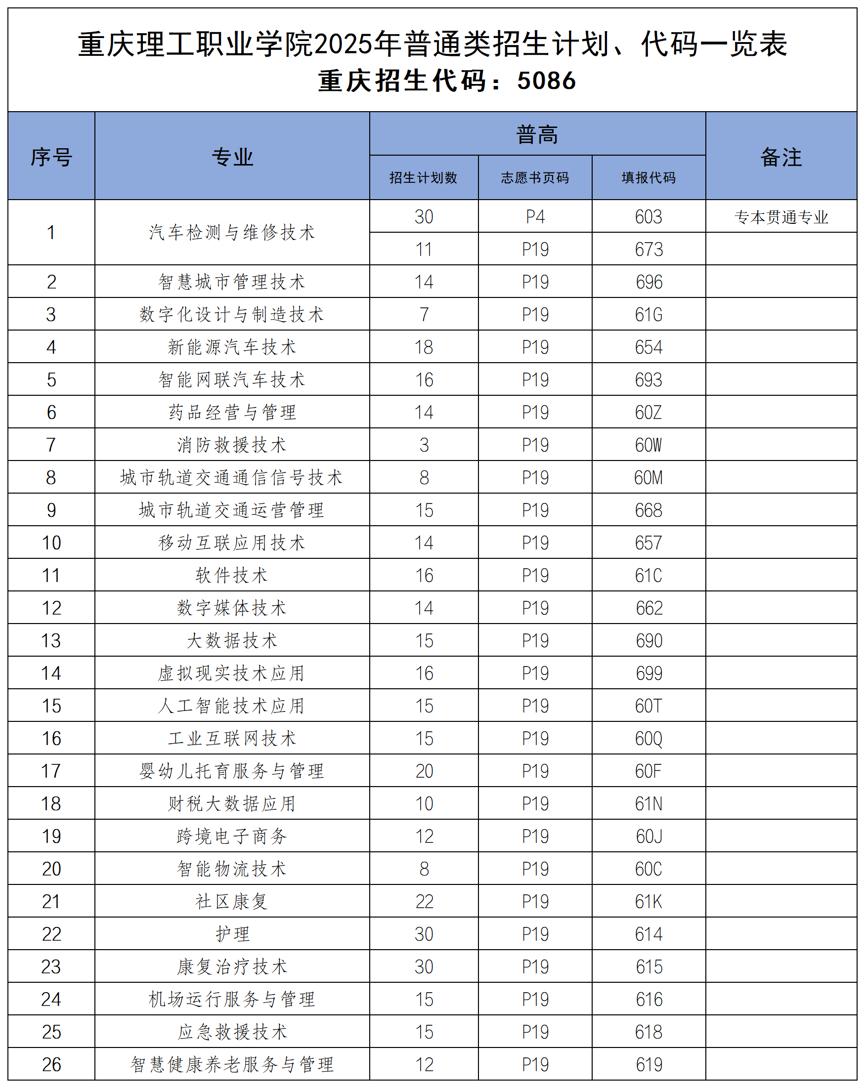 重庆理工职业学院是经重庆市人民政府批准、教育部备案的全日制普通高等院校,教育部代码14725。学校位于重庆市巴南区,占地1007亩,设施完善,环境优美,现设有智能工程学院、大数据学院、财经学院、卫生健康学院、国防科技学院、财经学院、通识教育学院等二级教学单位。学校坚持“向理向工向健康”理念,推进产教融合与国际合作,实施人才强校战略,与60多家知名企业合作,积极推进国际化进程,与10余个国家和地区的20余所高校建立合作关系。开设26个专业,建有多个实训中心,致力于培养高素质技术技能型人才。 志愿填报说明 (一)建议考生从1志愿开始,按喜好程度依次填报所有专业。多专业填报,覆盖高分专业,也覆盖低分专业,争取最大录取概率。(二)录取后,到校符合条件可申请调换专业。因材施教,尊重新生调专业意愿。 重庆市志愿填报统一网址(都有入口): 重庆市教育考试院门户网(https://www.cqksy.cn/)重庆招考信息网(https://cqzk.com.cn/) (可直接按照下表填报) 按照喜好程度调整志愿顺序 2025普通类