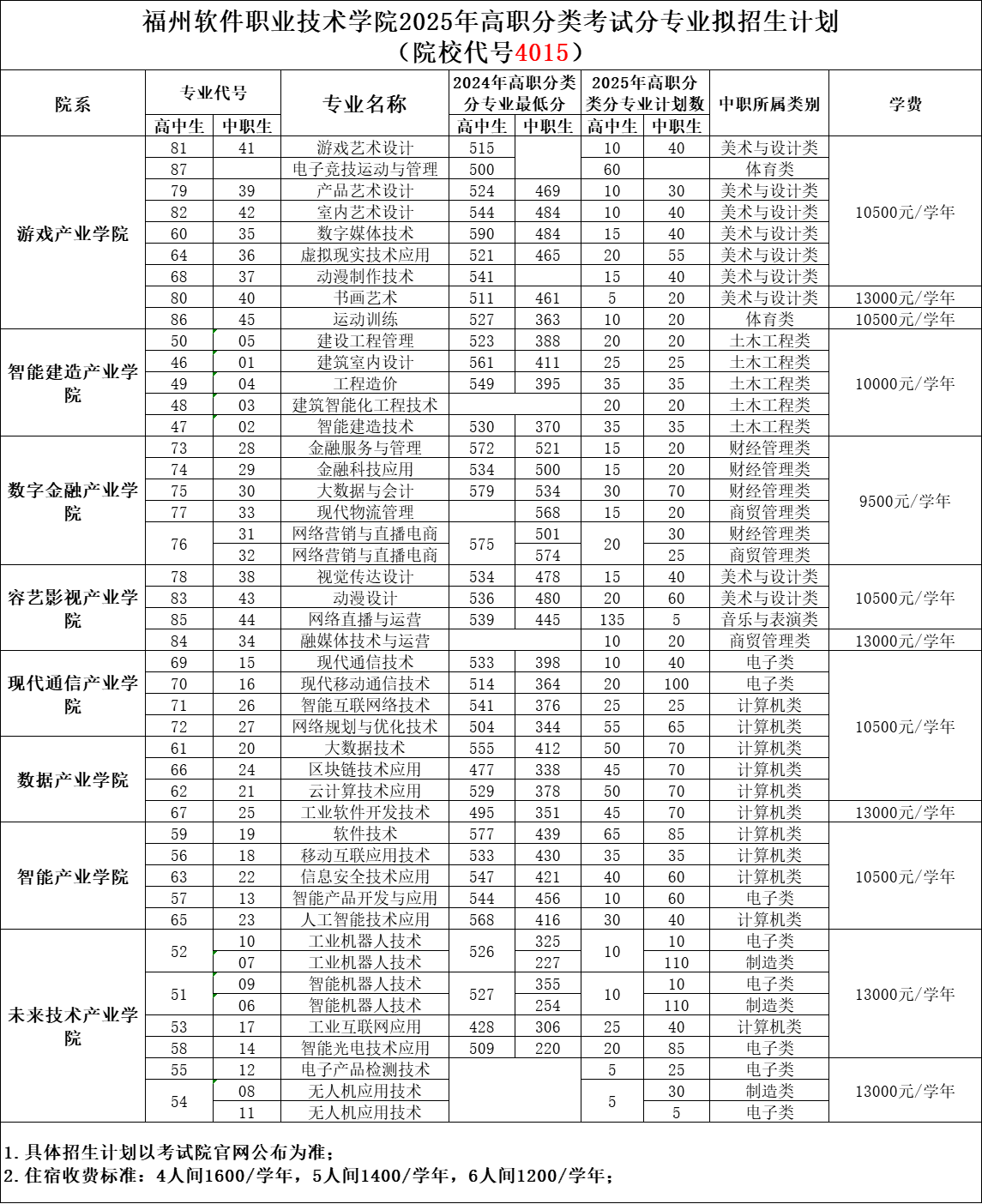 福州软件职业技术学院2025年高职分类考试分专业拟招生计划