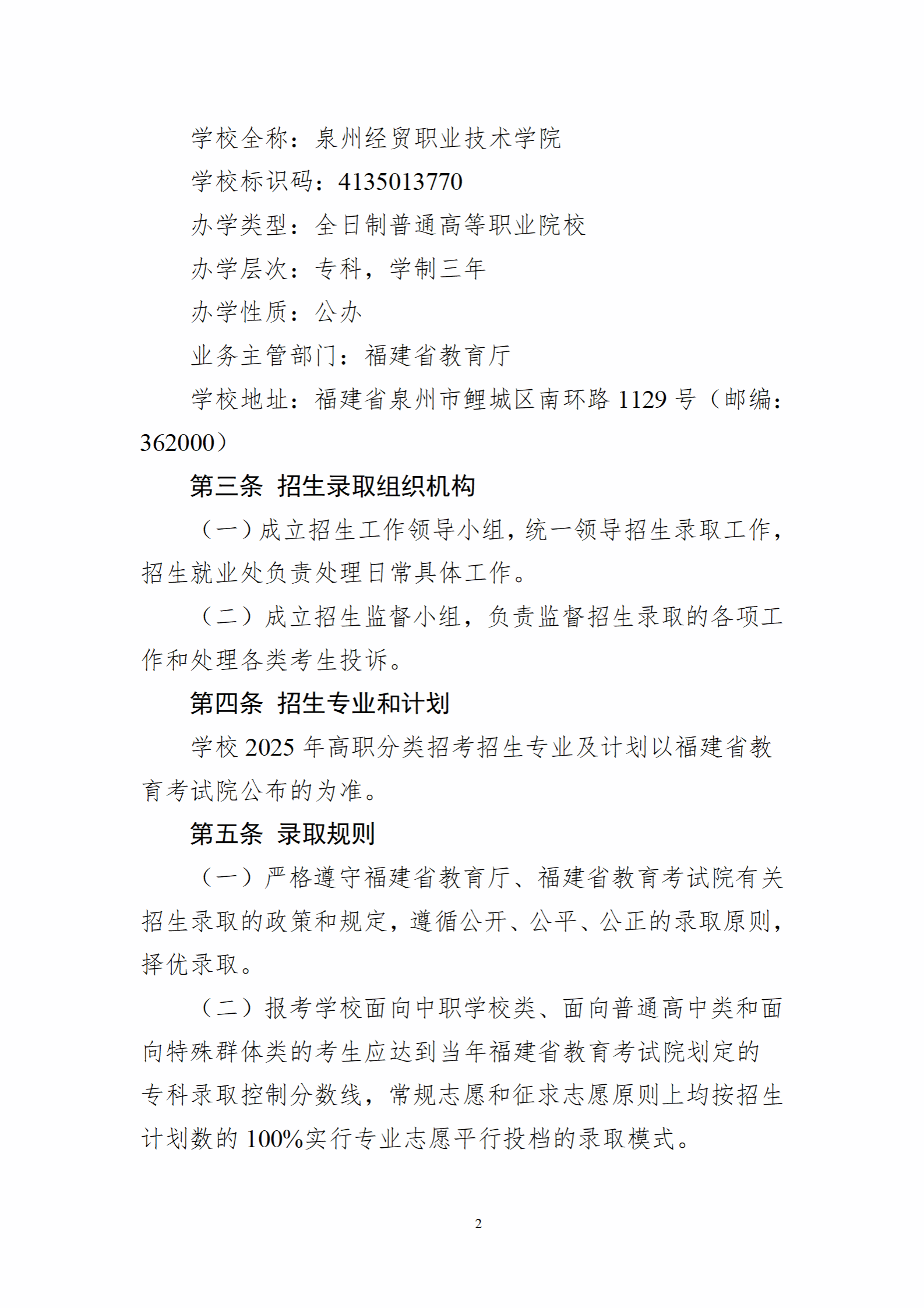 泉州经贸职业技术学院2025年高职分类招考招生章程