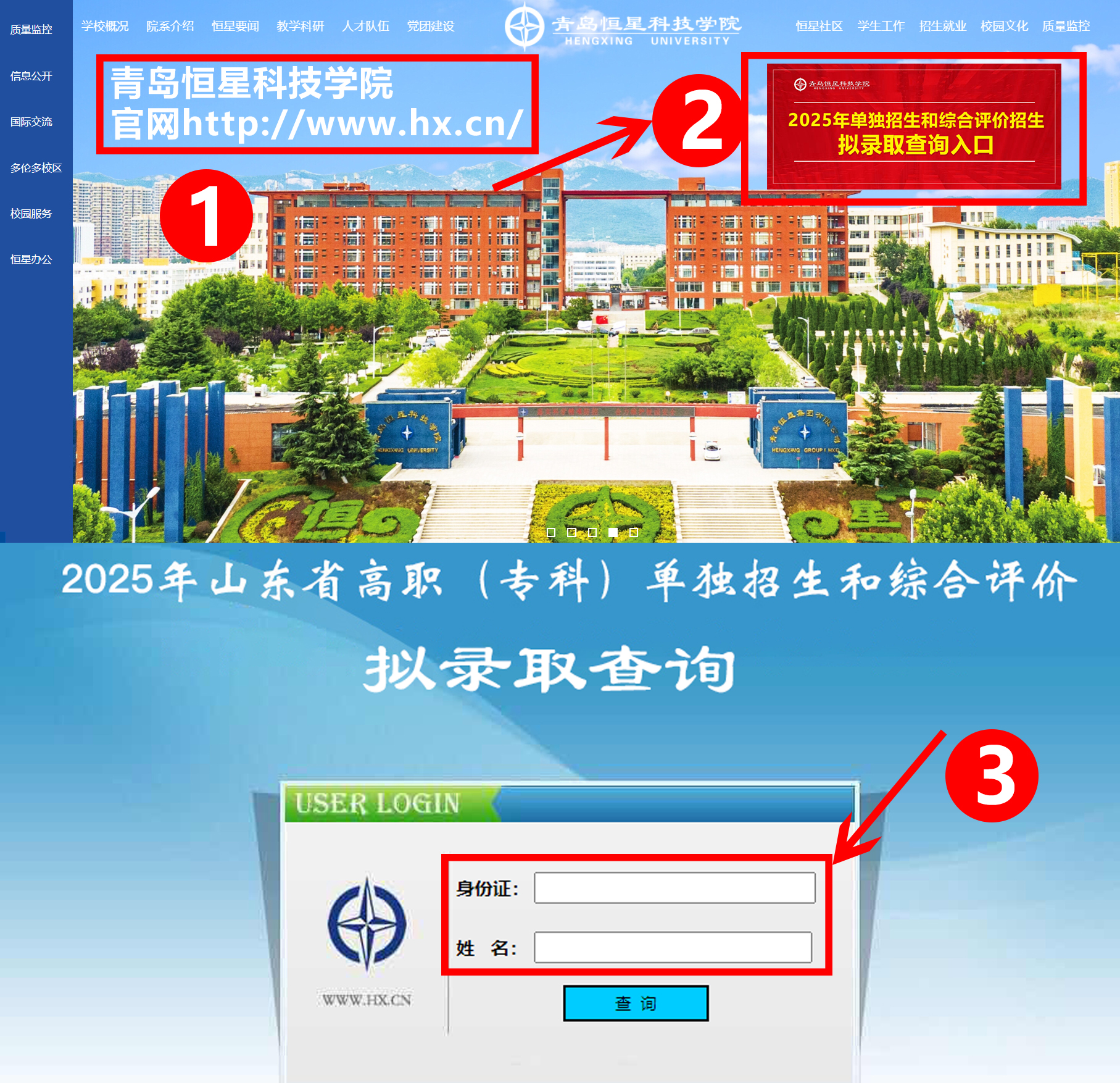 根据山东省教育厅《关于做好2025年高职(专科)单独招生和综合评价招生工作的通知》、《青岛恒星科技学院2025年高职(专科)单独考试招生和综合评价招生章程》相关规定,现将我校2025年单独招生、综合评价招生拟录取结果予以公示,具体公告如下:一、拟录取查询方式1.手机端:(以下网址,复制到浏览器中打开)http://lzsgl.hx.cn/2015/luquxinxichaxun/danzhaoniludenglu.aspx2.电脑端:登录青岛恒星科技学院官网(http://www.hx.cn/)--点击飘窗--输入“姓名”和“身份证号”--查询