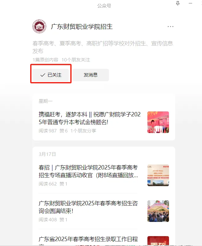 步骤一:搜索并关注我校官方招生微信公众号“广东财贸职业学院招生”