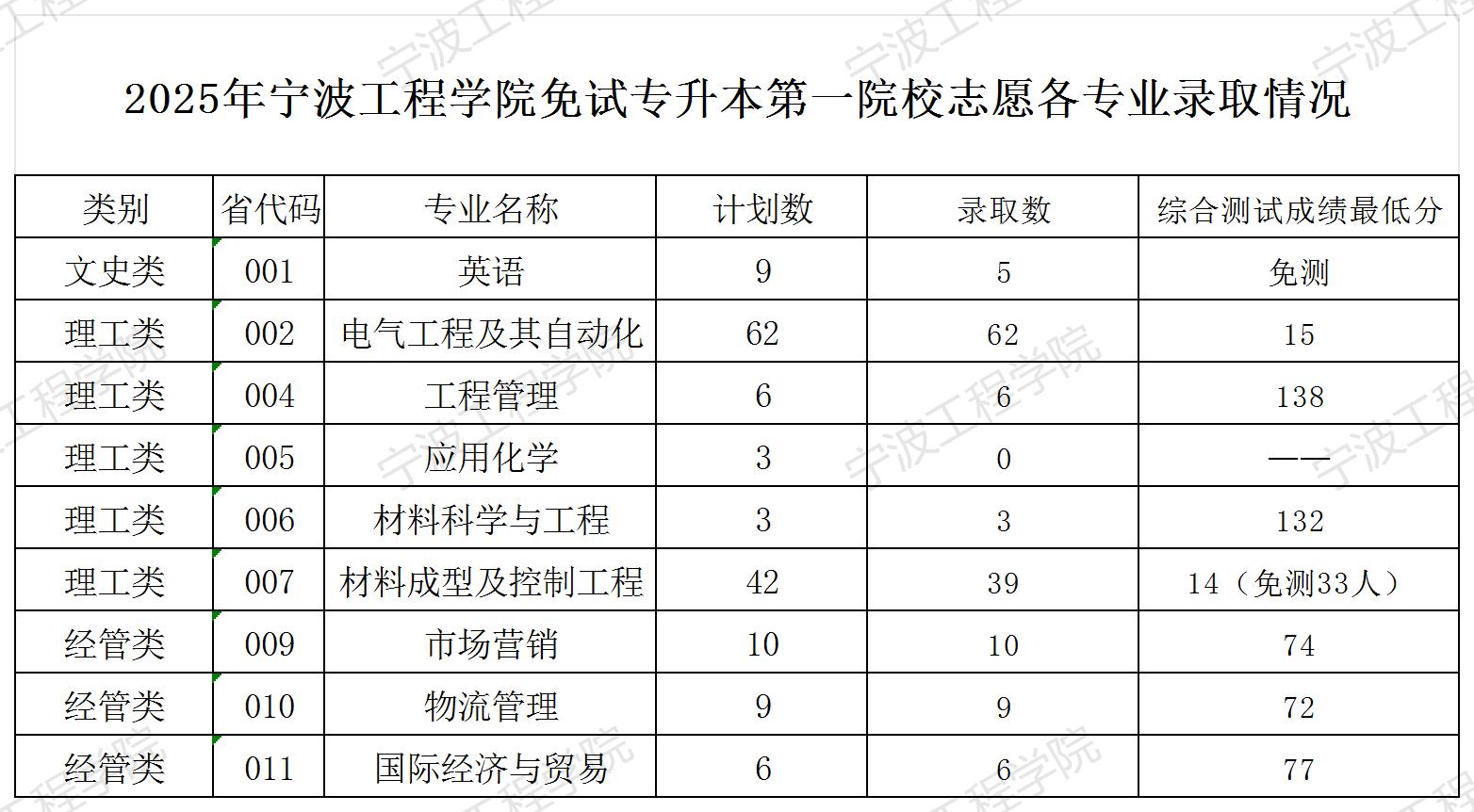 宁波工程学院2025年退役大学生士兵免试专升本第一院校志愿录取工作已经结束,考生可在宁波工程学院本科招生网通过【录取查询】通道自行查询录取结果和考试分数。各专业拟录取情况如下: