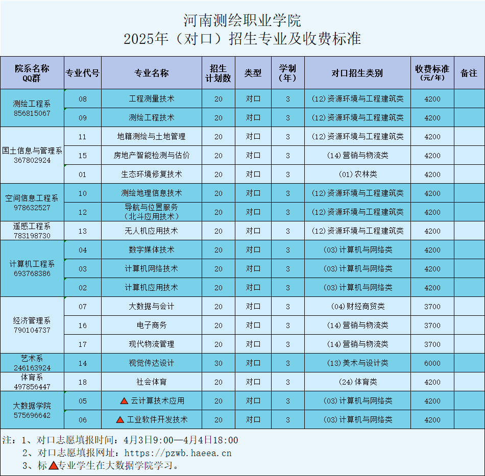 河南测绘职业学院2025年(对口)招生专业及收费标准