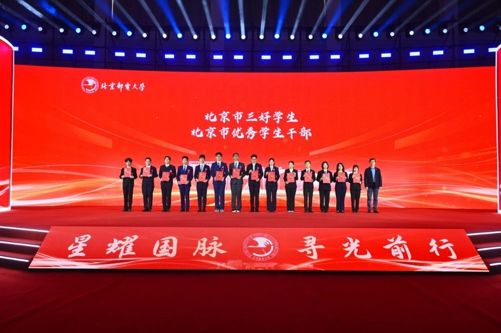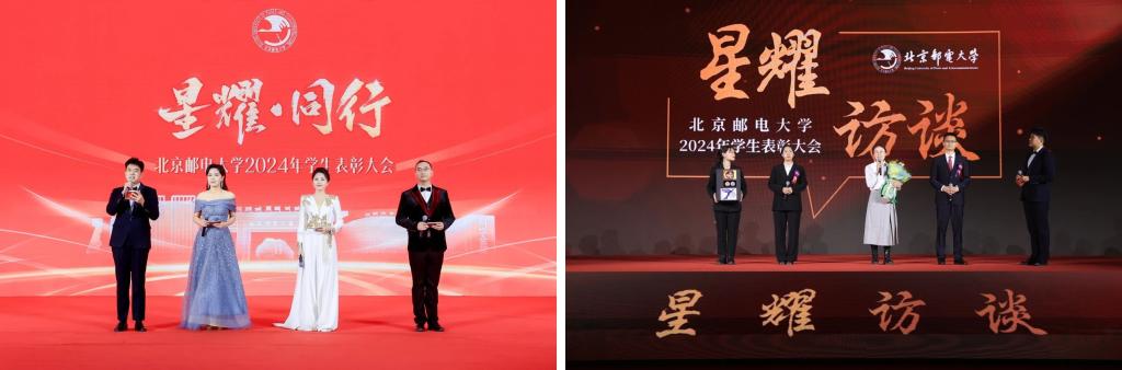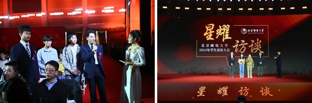 颁奖典礼由“星耀国脉 寻光前行”“青春绽放 向光而行”“卓越领航 逐光同行”三个主题篇章组成,穿插篇章视频记录学生成长足迹。被表彰集体和学生个人代表受邀星耀访谈,发表星耀宣言,围绕科研创新讲述成长过程中的温馨小事和触动瞬间,展现了北邮学子踔厉奋发、砥砺前行的昂扬精神风貌和勇于追光、敢于破壁的时代担当。