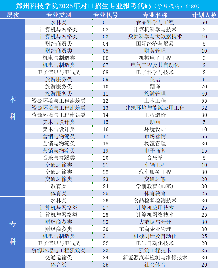 河南|郑州科技学院2025年对口招生专业计划一览表