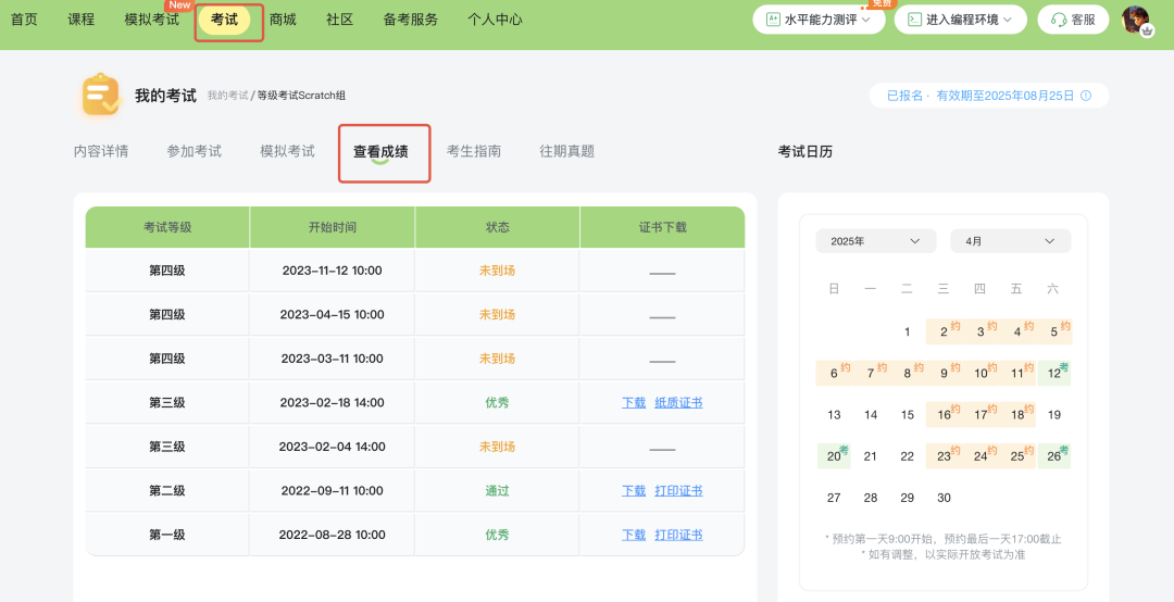 不仅如此,等级考试的考题严格围绕对应级别的知识点展开,绝不超纲,确保孩子能够在适合自己的范围内稳步提升。如此有意义的成长体验,你预约了么?当前,4月12日等级考试正在火热预约中,同时,上期考试成绩查询通道也已开放。