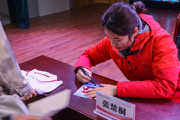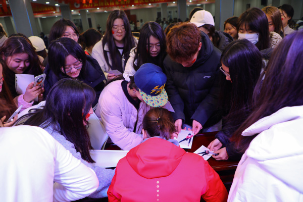 报告会设置了问答和签名环节,将现场氛围推向高潮。同学们踊跃提问,从训练技巧到比赛心态调整,从如何平衡学业与体育训练到未来职业规划,张楚桐一一耐心细致地解答。在签名环节,同学们满怀期待地拿出早已精心准备好的队服和记录着张楚桐高光时刻的比赛现场照片,有序地排队签名。她亲切地与同学们交流,满足大家合影留念的心愿,让这美好瞬间,化作同学们记忆深处的珍藏。