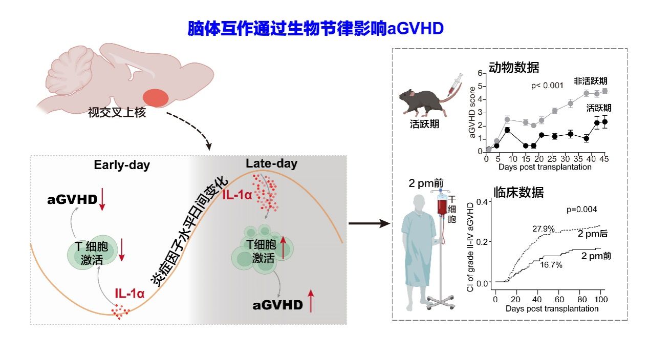 中国科学技术大学附属第一医院血液内科团队另辟蹊径,首次从受者自身生理功能受昼夜节律调控这一全新视角切入,通过动物模型以及临床队列研究,深入探究干细胞回输时间对aGVHD产生的影响,为该领域的研究开拓了新方向。这项研究提示临床医生,在开展Allo-HSCT手术时,需要高度关注治疗时间对免疫相关并发症的潜在影响,并在评估免疫相关治疗效果时,时间因素也应被纳入考量范围。