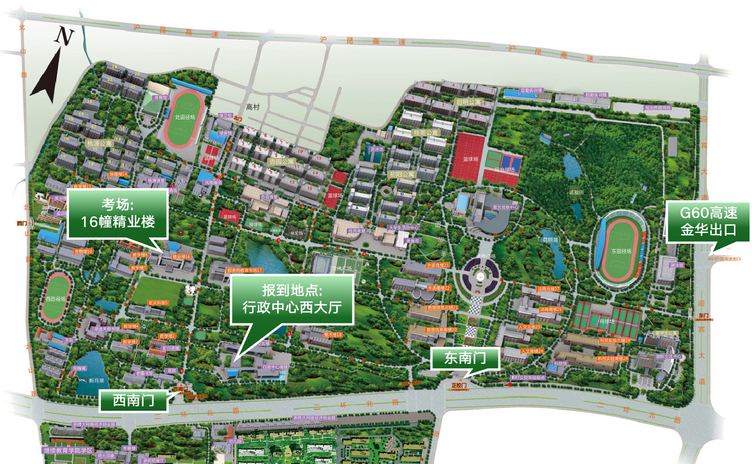 我校毗邻G60沪昆高速,请在“金华”出口下高速,行驶2公里左右即可到达浙师大西南门。