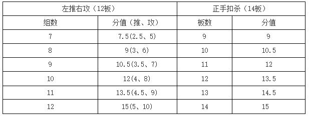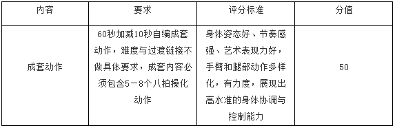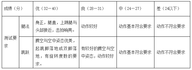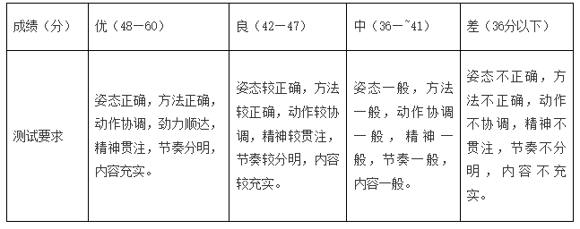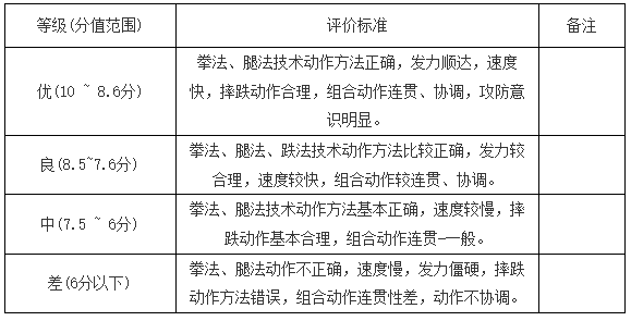 (2)评分标准:考评员参照拳腿跌组合评分细则,独立对考生的动作规格、劲力协调、攻防意识等方面进行综合评定。两名裁判分别采用10分制评分,所打分数至多可到小数点后1位。每漏做一种技术动作扣2分。两名裁判评分相加为最终得分。