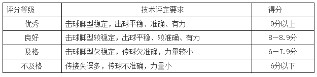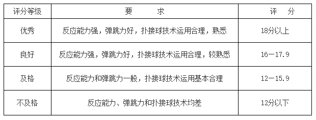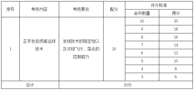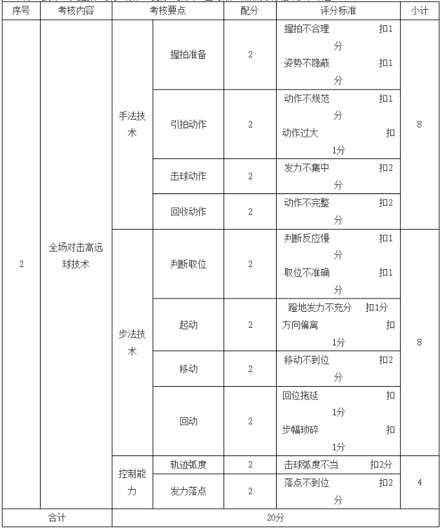2)击高远球(20分)技评:以握拍、脚步动作、发力、拍面、击球点、落点及规则要求来评定。