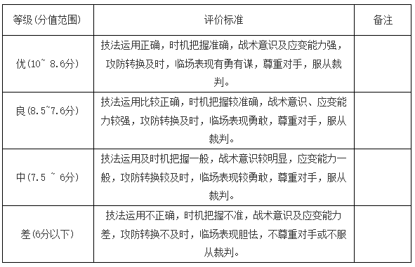 (2).评分标准:考评员参照实战能力评分细则,独立对考生在实战中的胜负、临