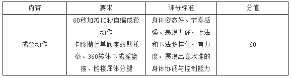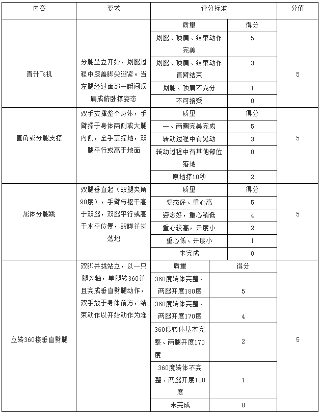 难度要求:A组难度不得多于3种不同类型的难度动作,每种不得超过两次,有两次以上的B组难度。