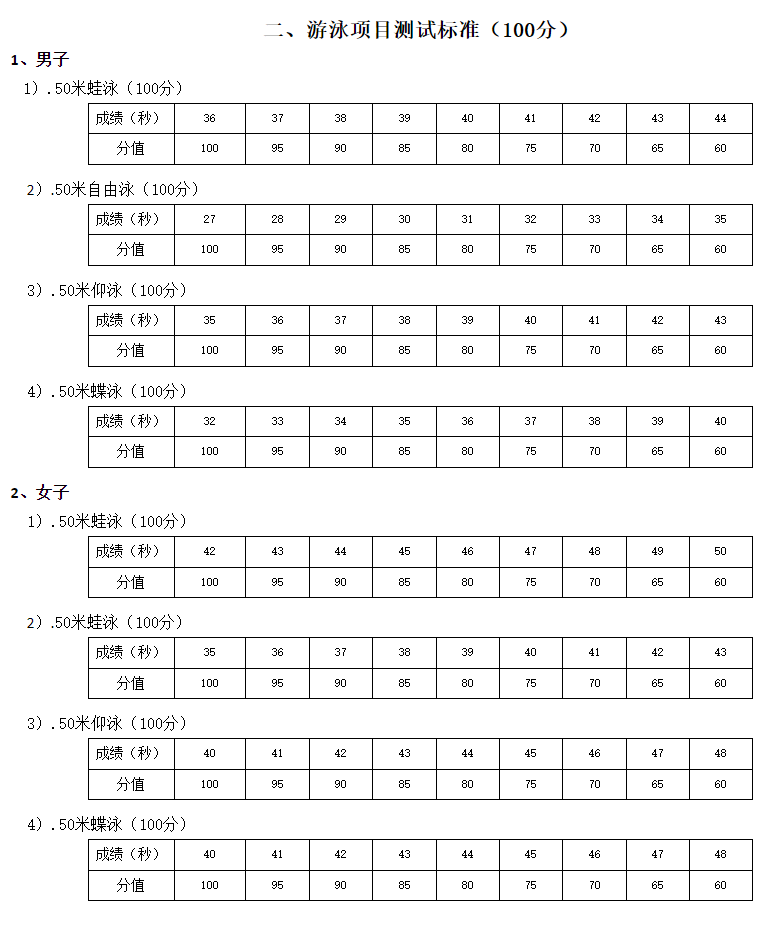 1、测试方法:站立式起跑,听口令起跑,计时评分。每人测试两次,取最好成绩。