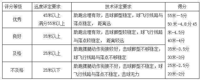 2、测试方法:学生将球放在限制线上,踢定位球,落点在足球场罚球区边线之间区域均为有效,以球第一落点为终点,测量距离。每人左右脚各踢3次,取最好成绩为考试成绩。