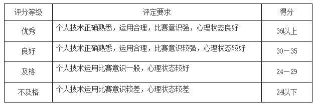 场技战术运用情况、意志品质以及对散打竞赛礼节的遵守等方面进行综合评定。采用10分制评分,所打分数至多可到小数点后1位。分值乘以6计入总成绩。