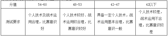 以比赛形式进行,看测试者是否有一定的进攻和防守能力,能够运用一些高级技术如:假动作、勾对角劈杀等;掌握一定的战术技能,知道如何调动对手寻找战机,知道何调整战术和心态。