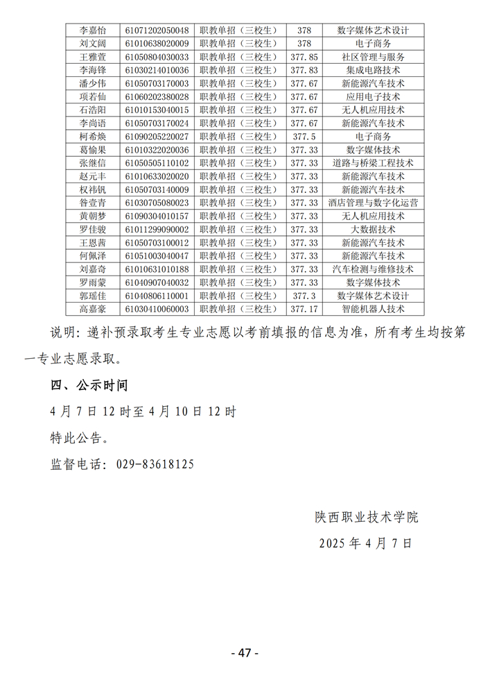 递补预录取的考生于4月8日上午8:00至4月10日中午12:00期间在我校白鹿原校区办公楼108办公室(招生办)刷身份证办理报到注册手续,逾期视为自动放弃我校递补预录取资格。