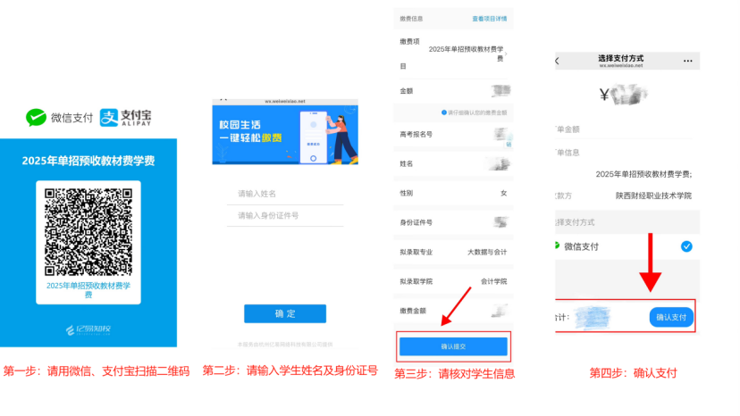 (1)扫码缴费:学生通过微信、支付宝扫描二维码,进入后输入学生本人姓名及身份证号码,点击确认进入缴费页面,注意:请先核对本人信息无误后,按步骤完成缴费。