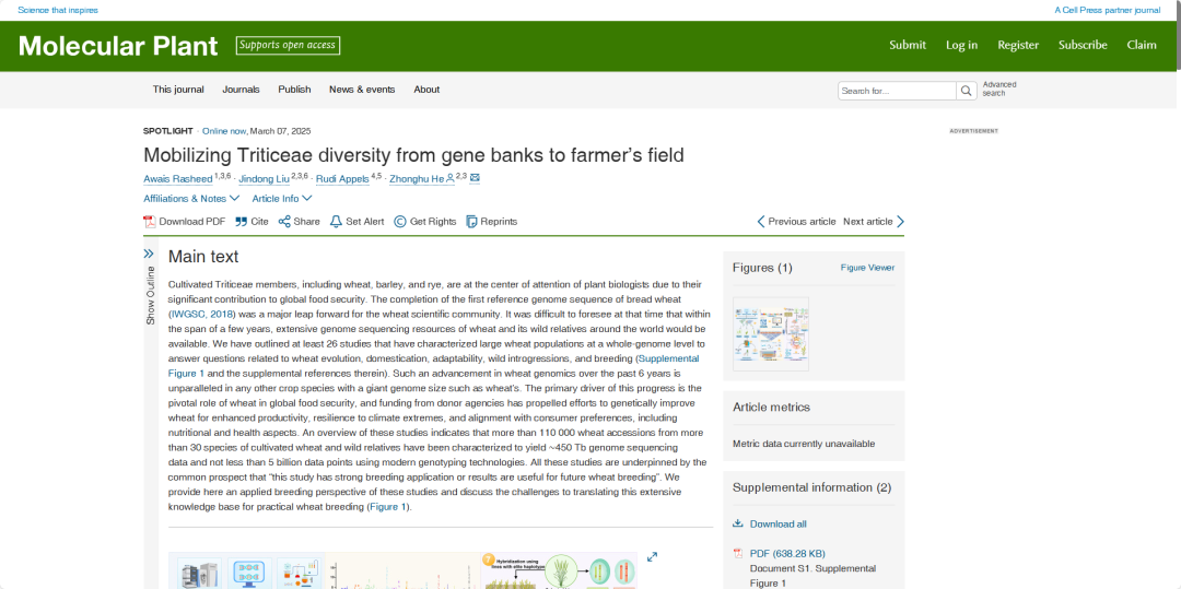 近日,国际权威学术期刊《分子植物》(Molecular Plant)发表了山东农业大学“CIMMYT-中国山东小麦玉米研究中心”与中国农业科学院作物科学研究所的合作文章,论文系统总结了近年来小麦基因组学研究进展与田间育种应用面临的挑战,为小麦基因组学研究与育种应用提供了新思路,为培育突破性小麦新品种奠定了重要理论基础。