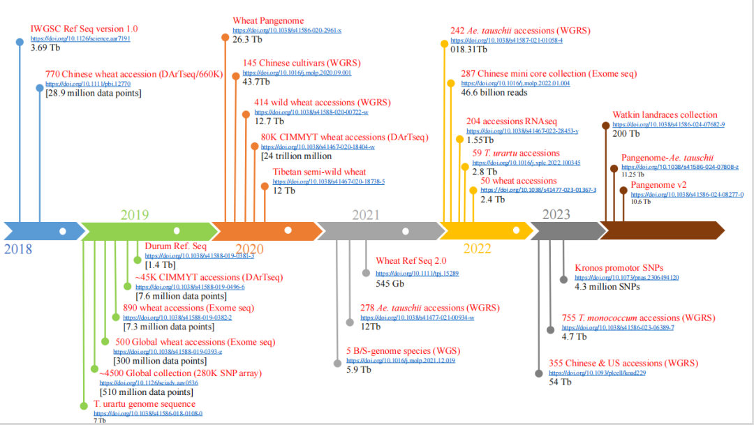 小麦是世界第一大口粮作物,但其产量和品质等重要农艺性状受多基因和环境互作影响,单纯依靠现有常规育种技术已经难以满足育种需要。基因组学研究为小麦育种带来了新契机,相关研究可以解析小麦的遗传信息,揭示其复杂的基因组结构和功能,同时运用基因组测序和功能基因分析,可以有效识别与抗病、抗逆、产量和品质相关的关键基因,加速分子育种进程,为小麦育种和改良奠定基础。自2018年首个普通小麦参考基因组发布以来,全球已组装了17个高质量小麦参考基因组,完成了11万份种质重测序分析,为小麦精准育种提供了潜在的新工具。
