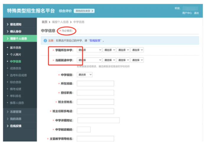 在下图中,填报个人信息页面,要注意区分学籍所在中学和当前就读中学。根据要求完善信息后,点击“下一步”进行“成绩信息”的填写。