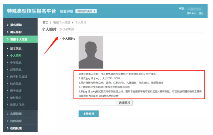 仔细阅读上图中的照片要求,将正确格式(png、JPG均可以)、尺寸的图片上传后进行下一步。照片大小必须在20k-500K。