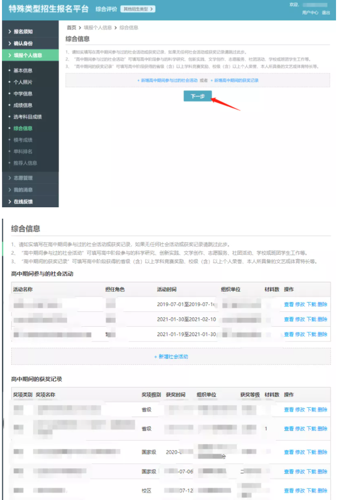 在下图中的“综合信息”部分,各位家长需要将考生原来在综合素质评价平台填写的信息,比如社会实践、社区服务、职业体验等项目填写到【高中期间参与的社会活动】板块,对于【高中期间的获奖记录】建议考生把所有的奖项都填写进来。