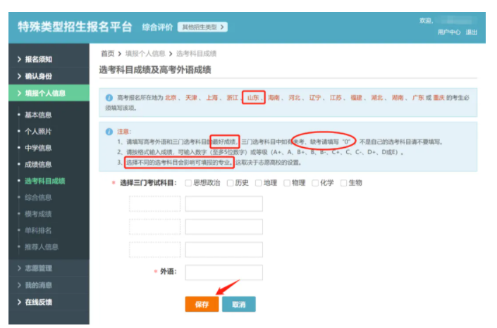 在下图中的“选考科目及高考外语成绩”部分,选考科目成绩可以填该科目日常最好成绩,但选考科目一定要与选择的专业要求相符!对于外语成绩,家长可以填写0或者最好的一次成绩。