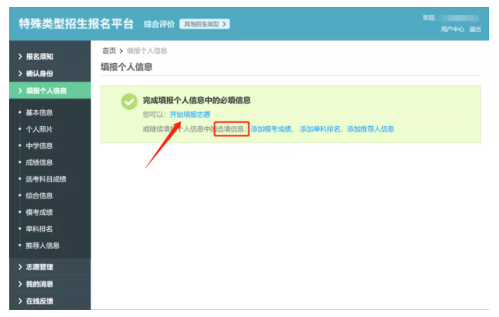 选填信息可以不填写,在“志愿填报”环节涉及相关内容时,再按照要求进行填写。点击“开始填报志愿”进入志愿填报环节。