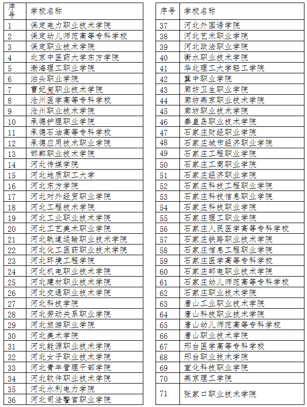经河北省教育厅批准,2019年在河北省进行高职单招的省内院校有71所,名单如下: