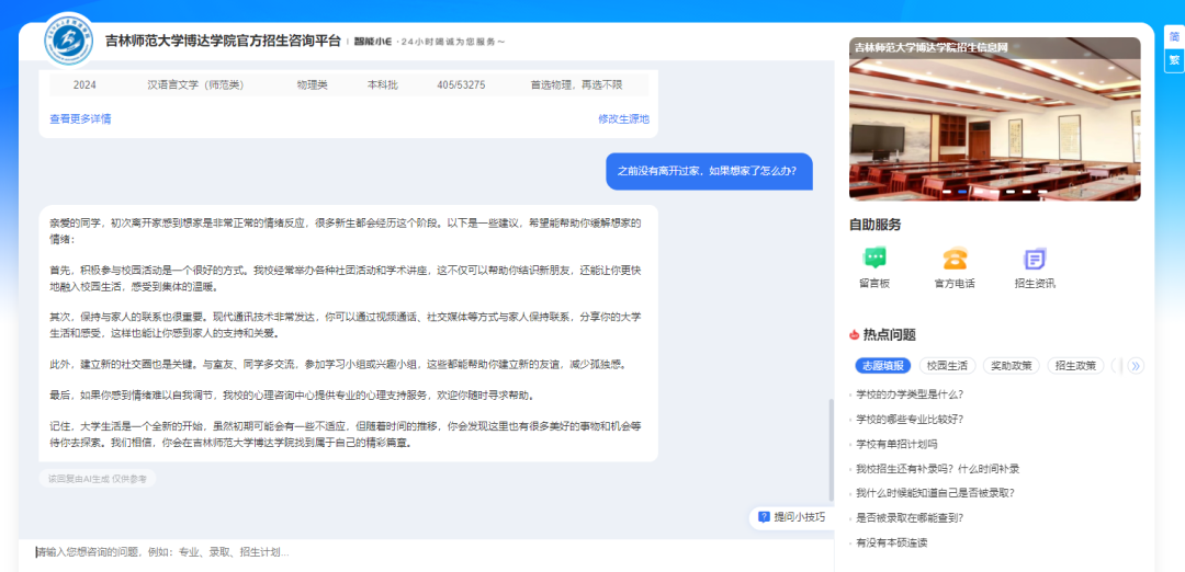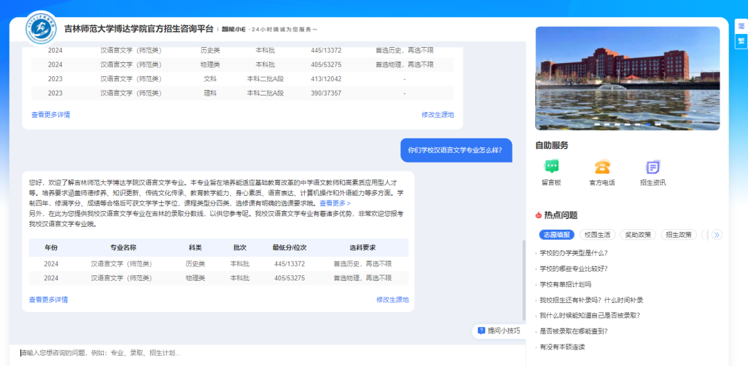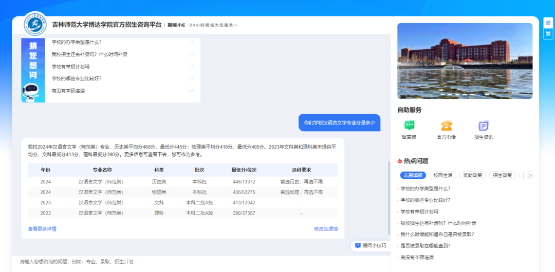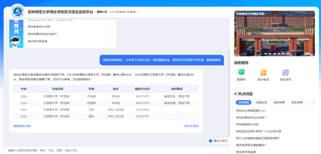 当你问“我是吉林省考生,今年考了450分左右,选考是物化生,想学你们学校汉语言文学专业,能被录取吗”时,系统不仅能通过DeepSeek大模型技术精准识别你的咨询意图是:省份、分数、选科要求、录取分数,还会结合历年录取数据,为你提供精准的回复!