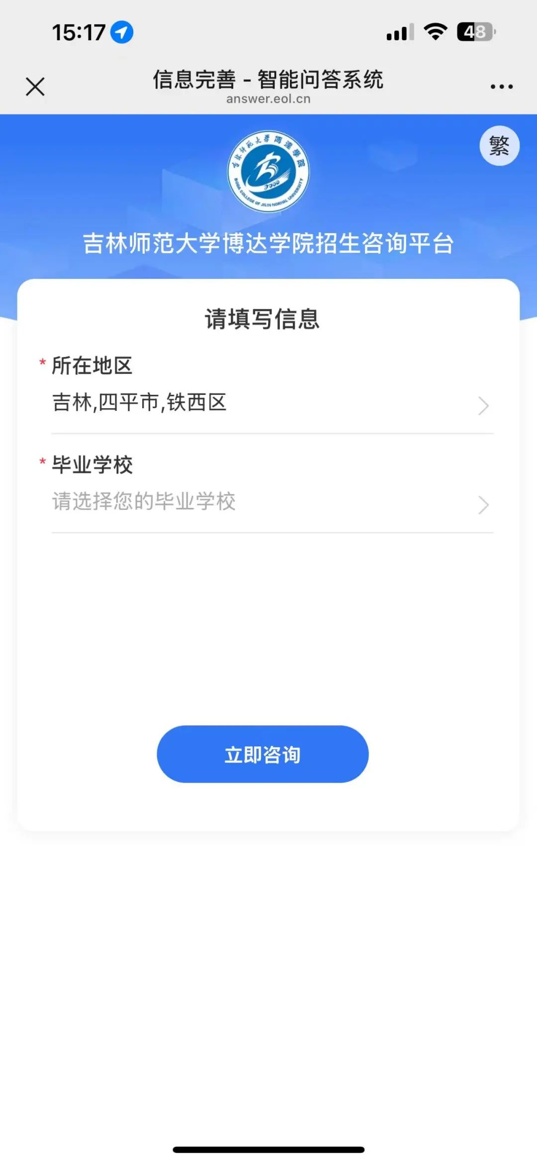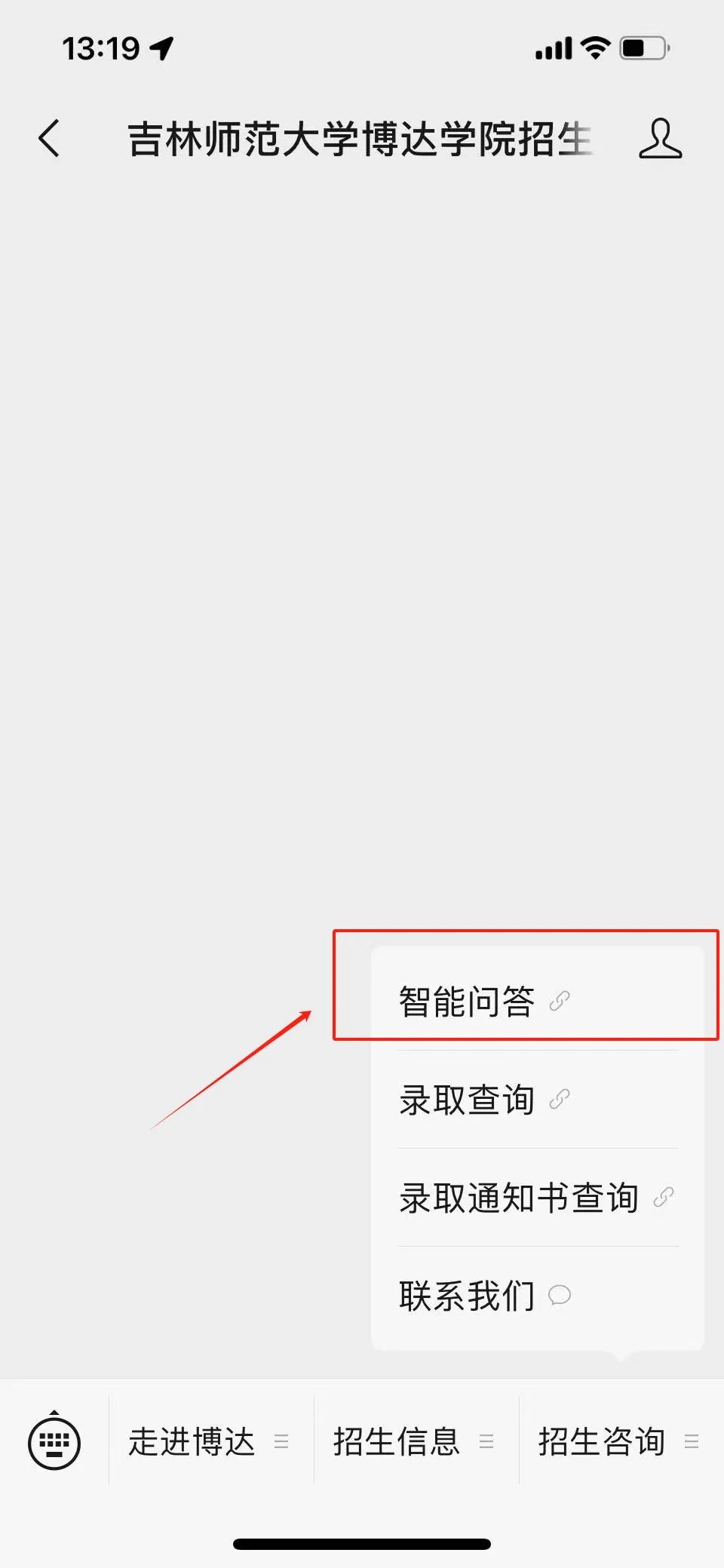 关注后可进入到【吉林师范大学博达学院招生办公室】微信公众号主页,点击底栏“招生咨询”“智能问答”即可在线咨询。