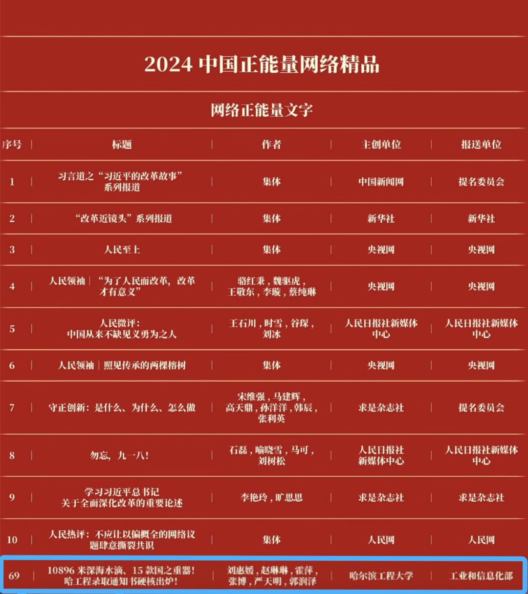 哈工程紧密结合学校船海特色,在招生季以录取通知书为载体,策划推出《10896米深海水滴、15款国之重器!哈工程录取通知书硬核出炉!》网络作品,阅读量10万+。推文全面展示了哈工程2024级录取通知书里,硬核装备“悟空号”带来的刷新深潜世界纪录的万米深海之水,造船工业皇冠上的“三颗明珠”“奋斗者号”等15个国之重器,将哈工程青年学子以“为船为海为国防”为责任担当,走向深蓝、实现海洋强国的使命融入其中。人民日报、中国青年报、光明日报、科技日报等10余家国家级媒体掀起报道热潮。学校招生话题连登3次微博热搜,阅读量1.4亿。学校获评“全国高校招生关注度10强高校”。