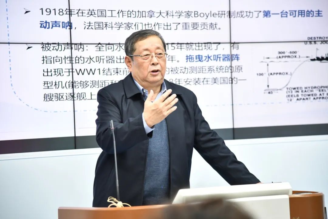 这一课不光有历史,也有前沿。杨德森院士在讲到水声领域的发展现状时,列举了当下国际前沿理论探索前景和最新科研技术,深入浅出,旁征博引,展现了丰厚的学识和超前的思维。同学们专注听讲,对水声学有了更全面的认识,也对今后的科学研究产生更浓厚的兴趣。