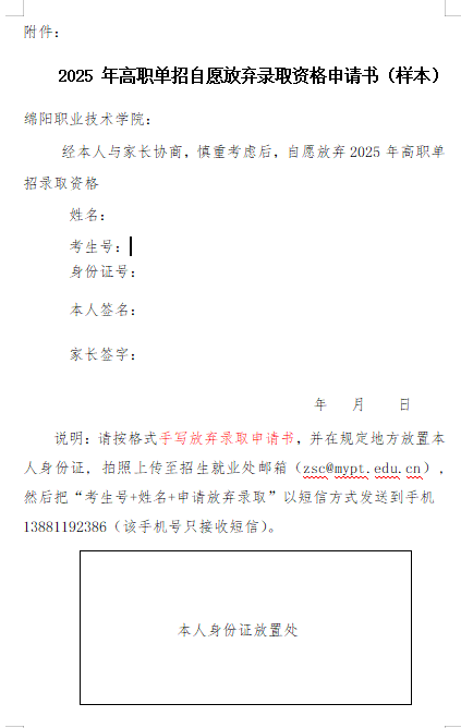 根据《绵阳职业技术学院2025年高等职业教育单独考试招生章程》的规定,现将2025年高职单招考生申请放弃录取相关事宜公告如下:
