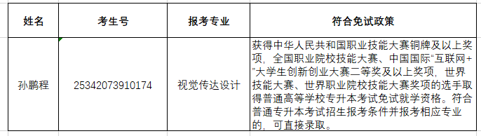 根据《安徽省2025年普通高校专升本考试招生工作操作办法》(皖招考〔2025〕3号)和《合肥经济学院2025年普通高校专升本招生章程》等文件精神,依据安徽省教育厅下发获奖名单,经考生本人自愿申请,学校对考生提交的材料进行审核,拟认定孙鹏程同学符合“免试就学”鼓励政策,现将结果予以公示。
