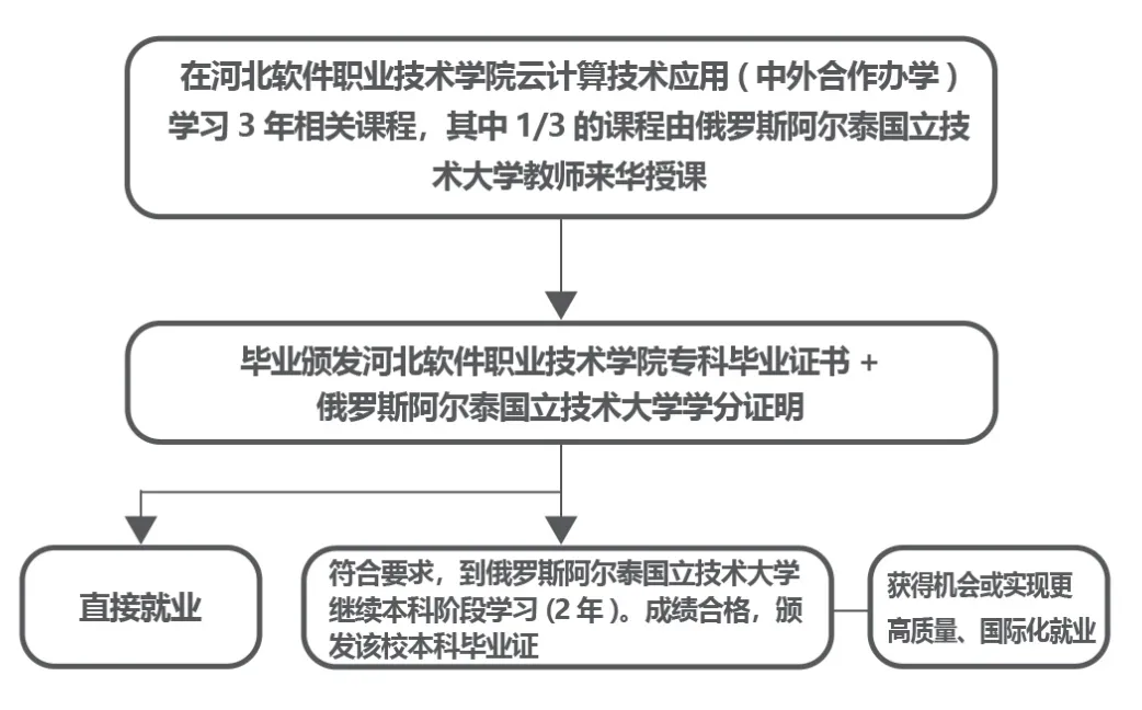 与外方共同搭建课程体系,引进外方的本科课程、教学资源库及师资。专科毕业后,俄语达到外方院校相关要求,可自愿赴俄罗斯攻读该校全日制本科,学制二年,毕业生获得文凭,可在国内教育部留学生服务中心认证,可以在我国国内考硕士研究生、博士研究生、公务员、事业编、参加企业招聘(享受海归人才政策)。