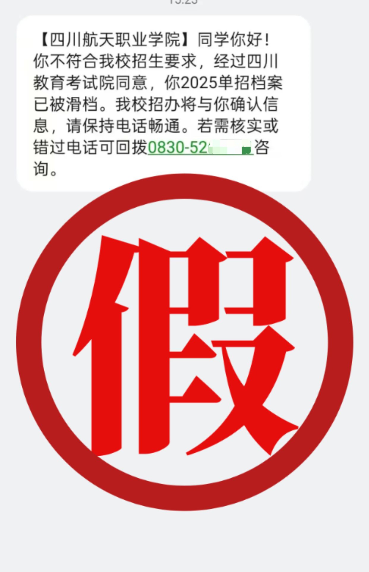 今日,我校接到考生及家长举报称在短信平台和某机构冒用四川航天职业技术学院招办名义发布虚假单招录取信息,违规开展招生宣传活动。误导广大考生和社会公众,造成了极其不好的社会影响,严重损害了我校的良好声誉。