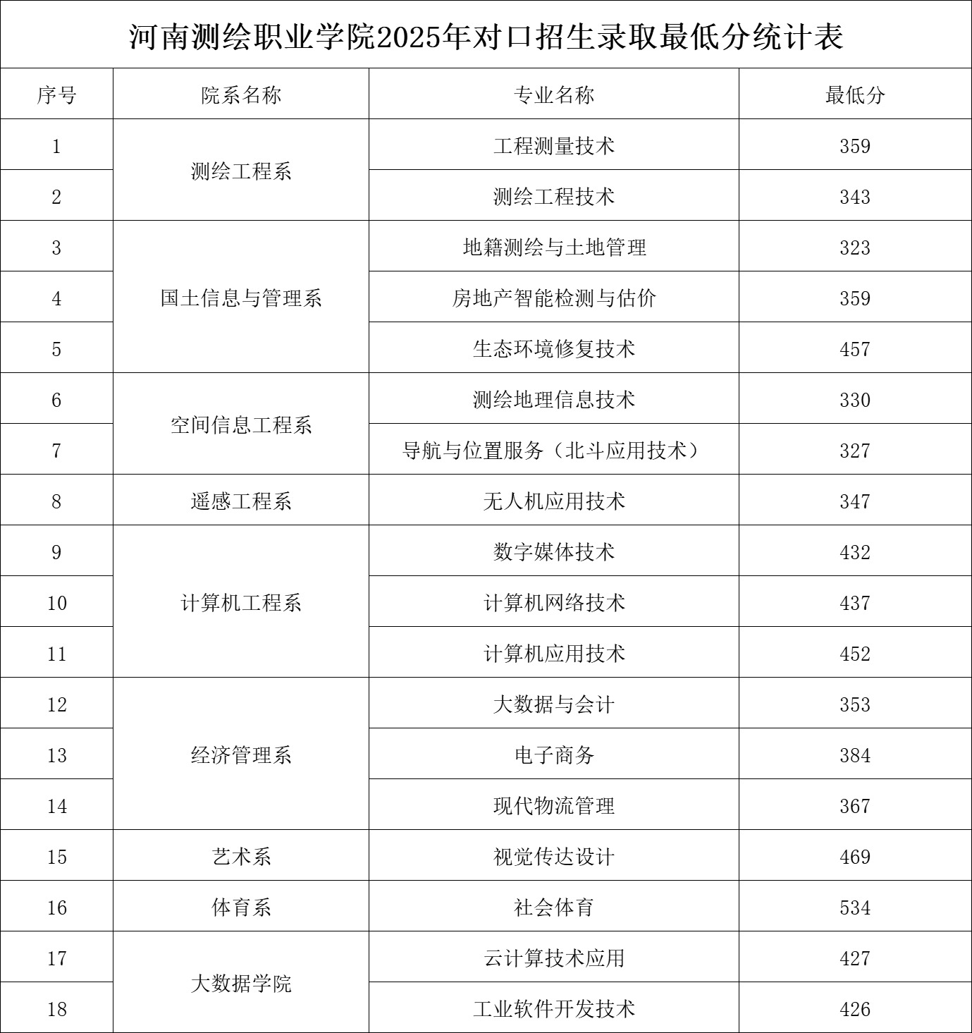河南测绘职业学院2025年对口招生录取最低分统计表