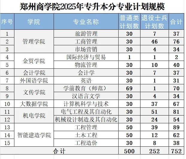 2025年专升本各专业招生计划如下